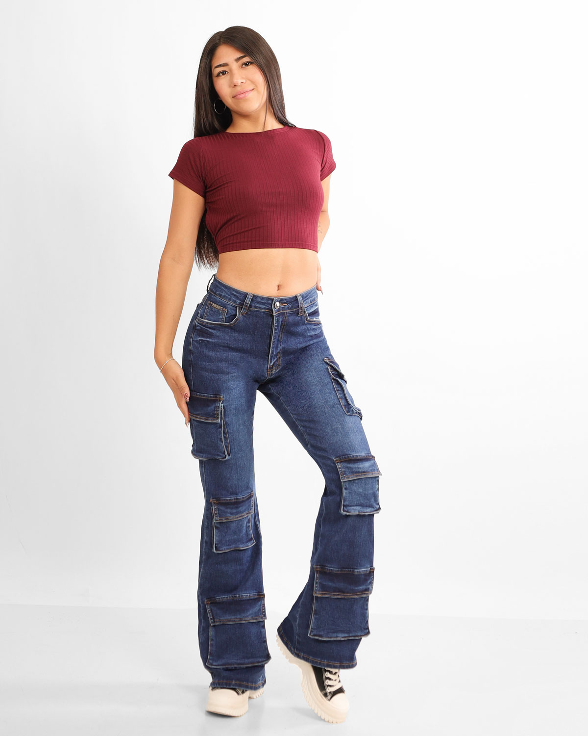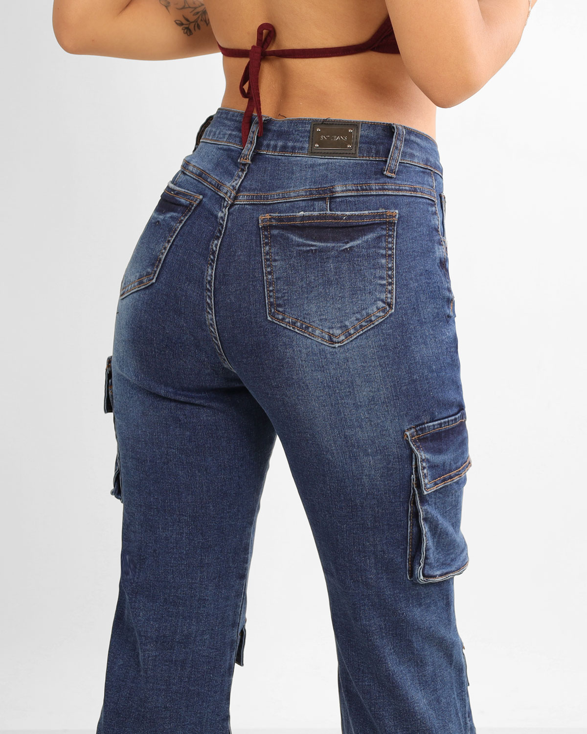 Su tiro alto realza la cintura y estiliza la silueta, mientras el corte push up potencia las curvas de manera natural. El diseño cargo incorpora múltiples bolsillos funcionales distribuidos a lo largo de las piernas, aportando un look urbano, moderno y con carácter.