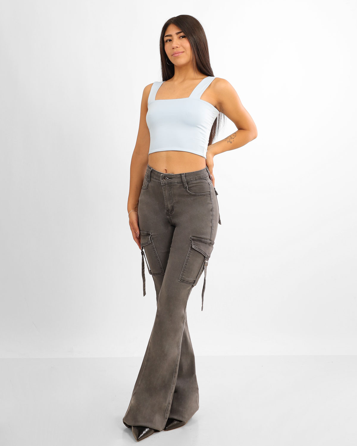 Su tiro alto estiliza la cintura y aporta una silueta más definida, mientras el corte push up realza las curvas de forma natural. El diseño cargo incorpora bolsillos laterales funcionales con tiras decorativas, sumando personalidad y un estilo contemporáneo.